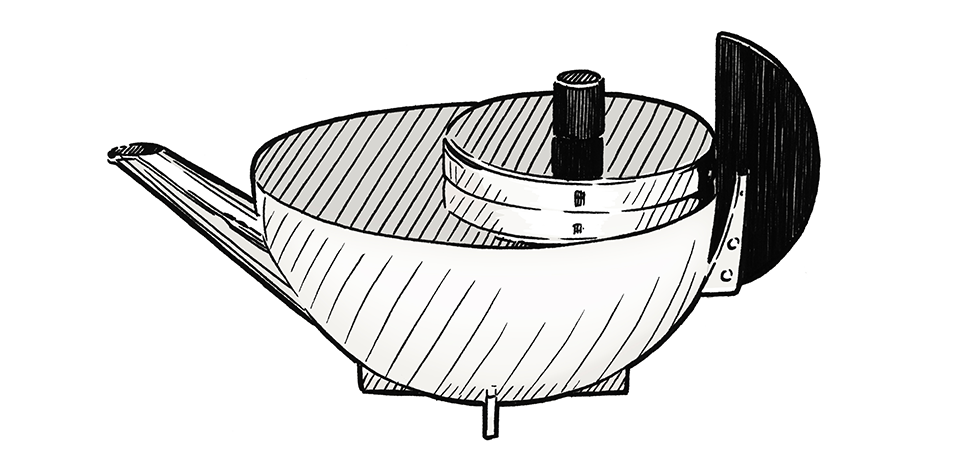 Bauhaus ideas are neatly summed up in this teapot from 1924. With its flat top and D-shaped ebony handle, kitchenware had never seemed so novel. The novelty also lay in its size: at just slightly more than 7cm high, the infuser and built-in strainer were designed to make a concentrated brew that would be diluted with hot water in the cup. Tea connoisseurs have cause to frown at this method but true to the German design movement’s ethos, it was efficient and space-saving above all.
