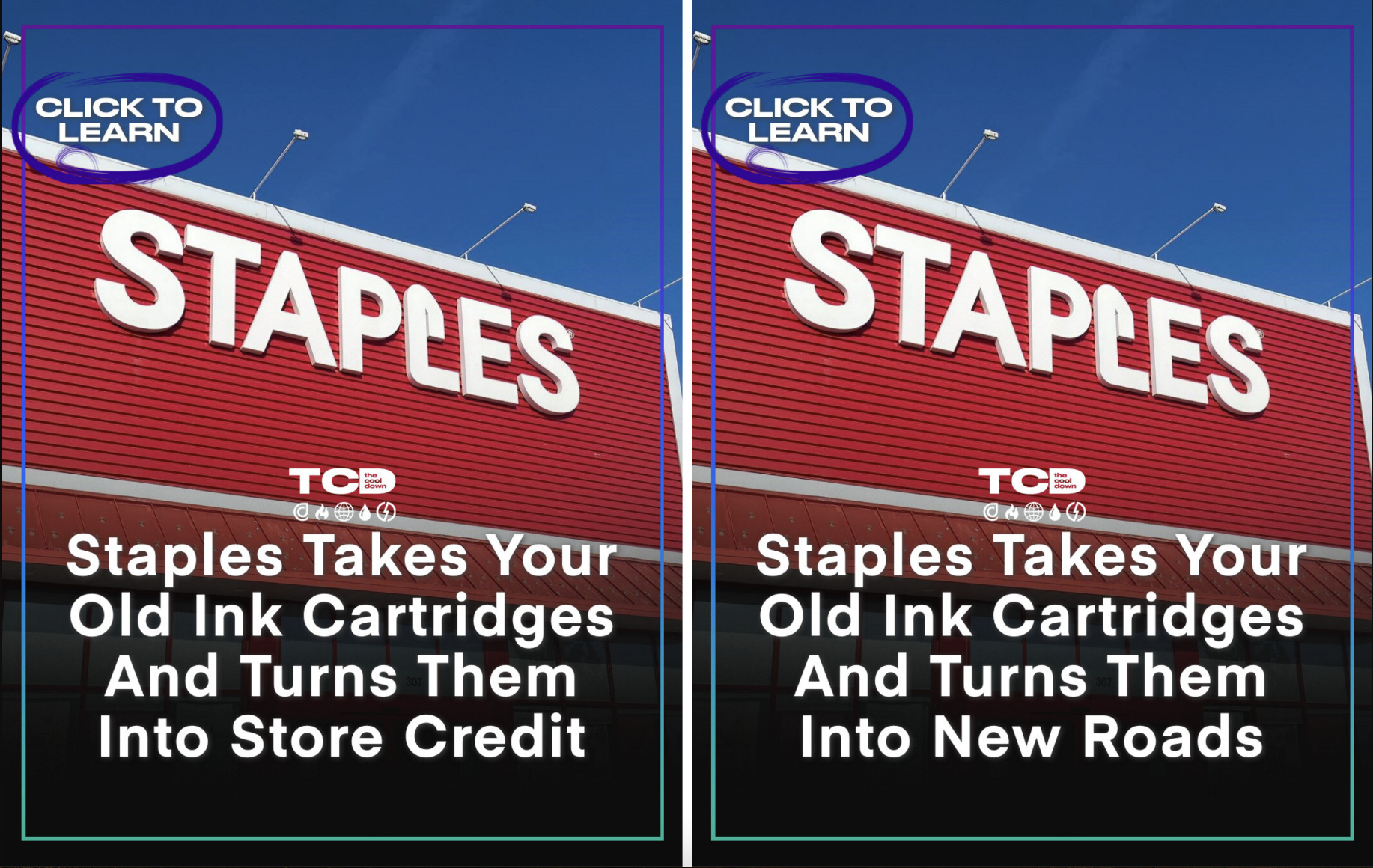 To test how brands can engage consumers around recycling programs, we ran an A/B test highlighting Staples’ ink-recycling initiative. One ad focused on financial compensation for turning in old ink cartridges, while the other strategy focused on repurposing them as road material.