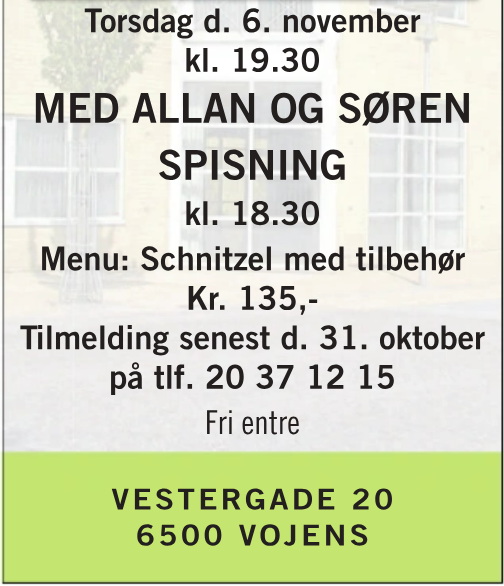 Sted: Vojens Kultur- og Musikhus (Vestergade 20, 6500 Vojens) og Vedsted Landbohjem (Tøndervej 73, 6500 Vojens)