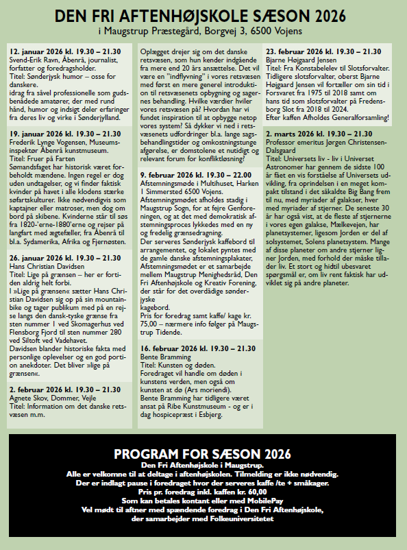 Tid: Mandag den 26. januar 2026 kl. 19.30 Sted: Maugstrup Præstegård, Borgvej 3, Maugstrup, 6500 Vojens