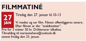 Program: Vi mødes og ser en film. Efter filmen er der “snak & snitter”
