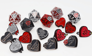 New for Valentines Day, this Complete Set contains ALL 6 Designs of Grim Hearts D20s and ALL 12 Mini Pins. This Complete set gives you one of each pin and one of each die!