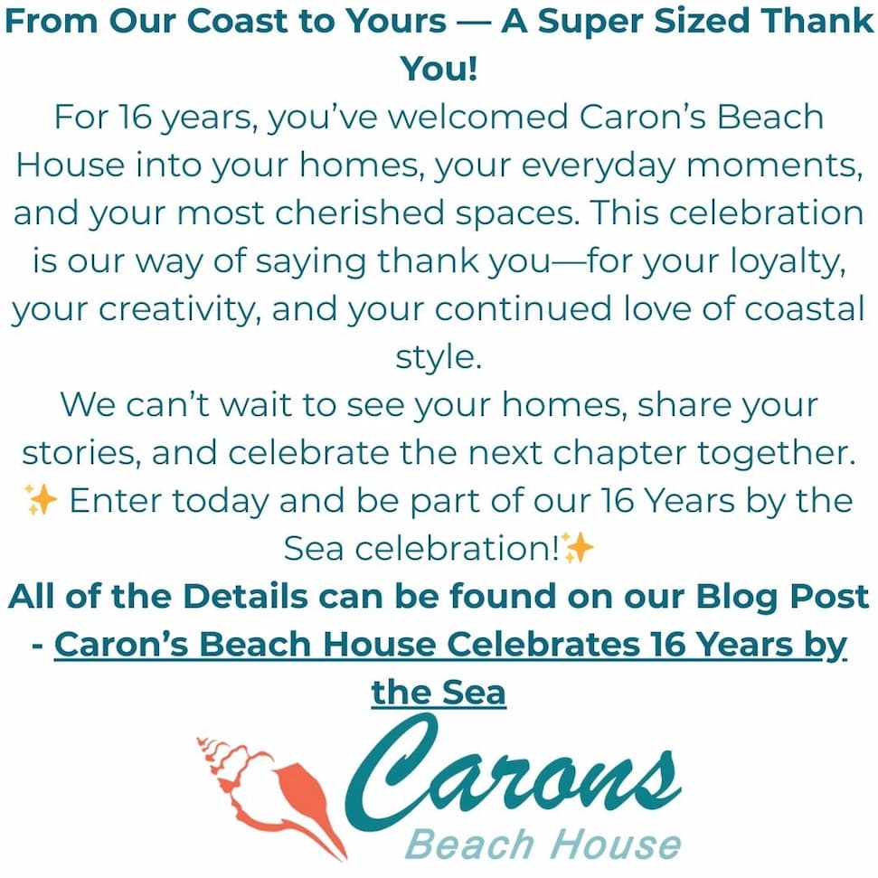 For sixteen years, Caron’s Beach House has been inspired by one simple idea: beautiful coastal living begins at home. What started as a passion for relaxed seaside style has grown into a vibrant community of customers who bring our designs to life every day. From sunlit living rooms and serene bedrooms to inviting porches and breezy outdoor spaces, your homes are the true heart of Caron’s Beach House.